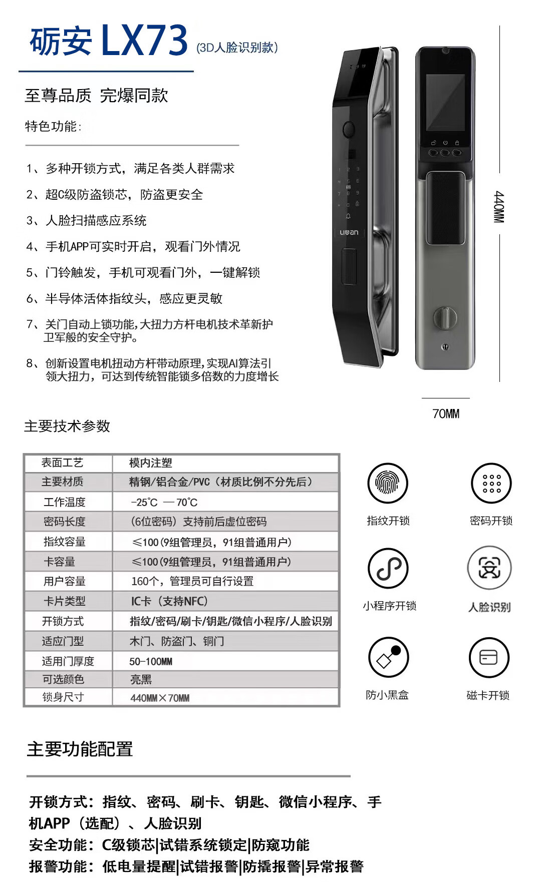 商品名称:砺安LX73 3D人脸+猫眼全自动智能锁/家用防盗门锁