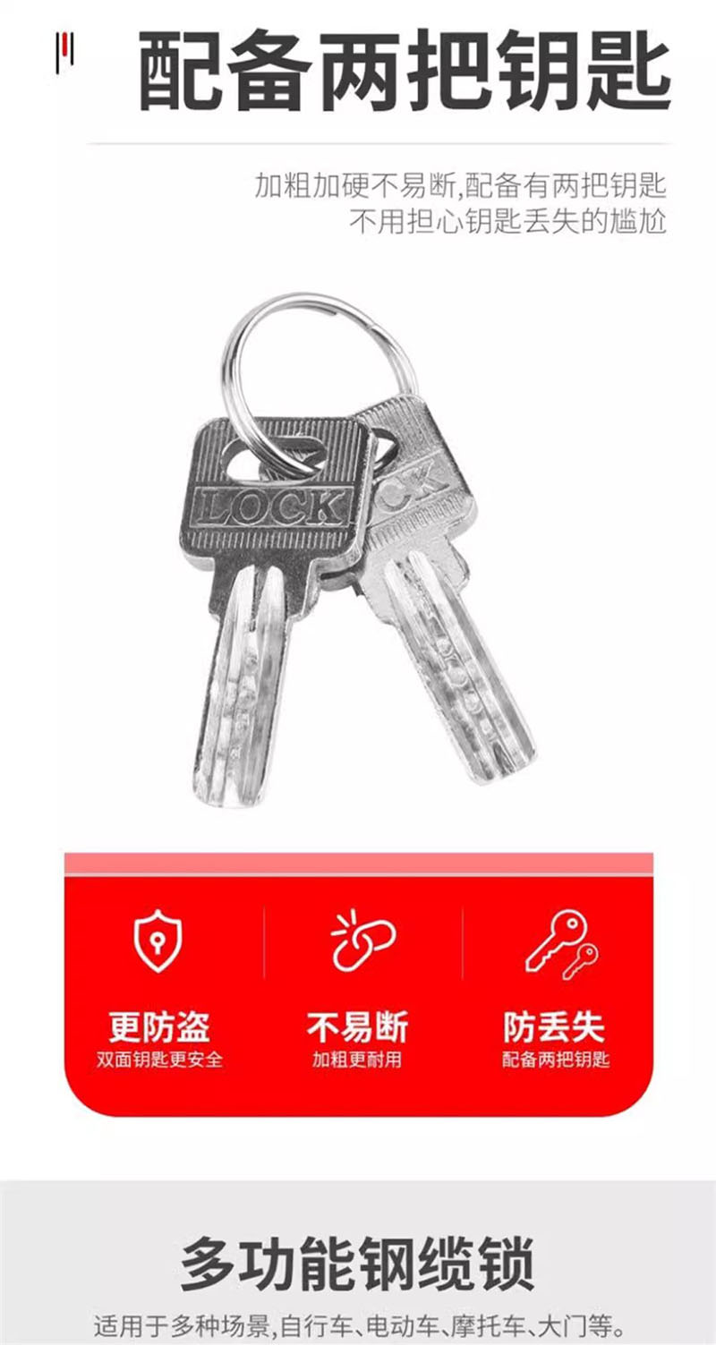 商品名称:钢丝锁17cm粗*100cm长原子山地自行车锁钢丝锁钥匙钢绳防盗链条锁电动车摩托车软锁单车配件