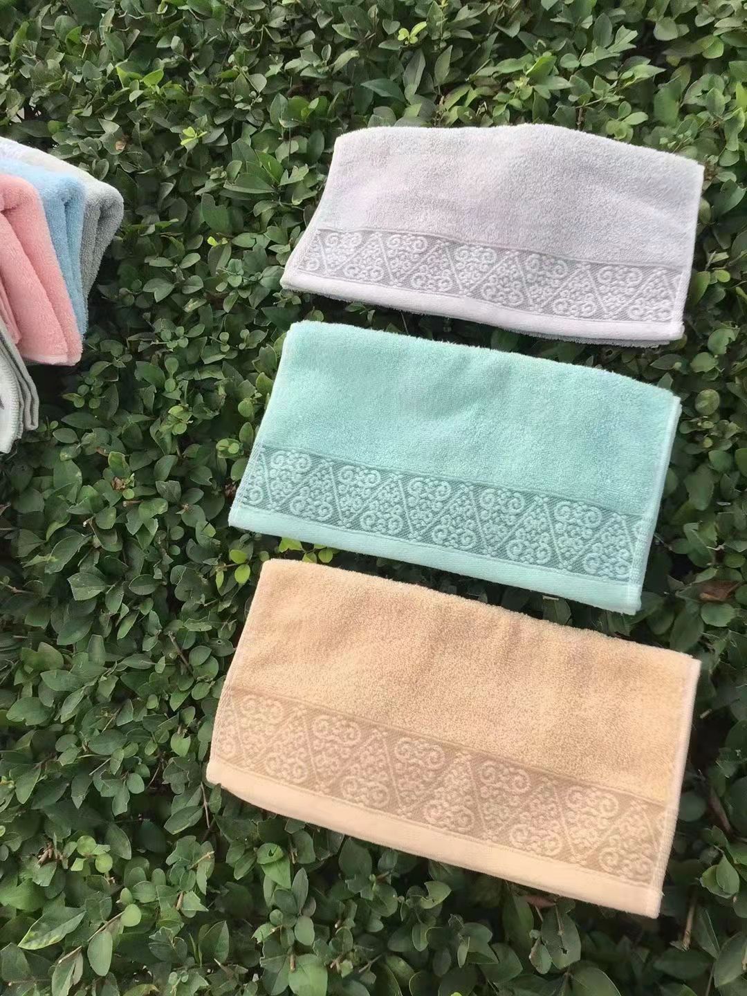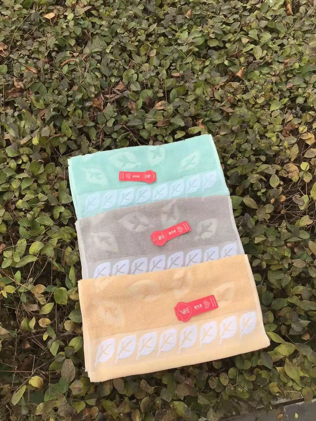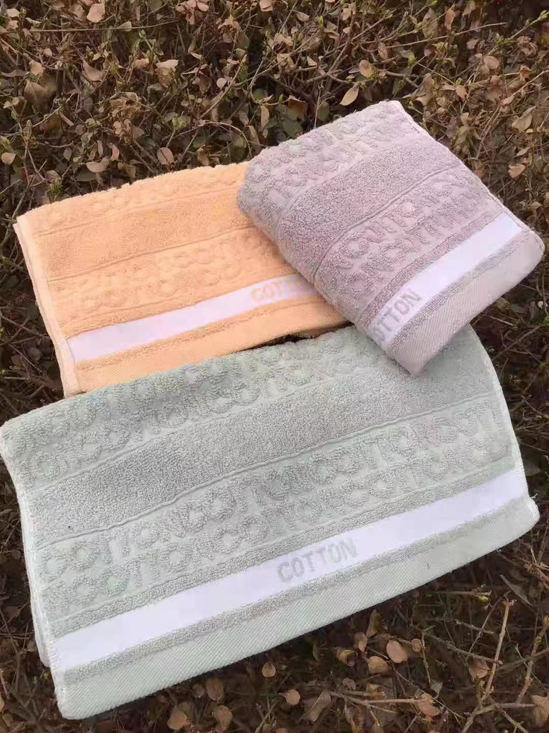 商品名称:14支弱捻纱毛巾 尺寸34cm*74cm 重量110g房子.素运动.三角花.绿茶.树叶花.素字母.字母衣服.三段条等图案毛巾