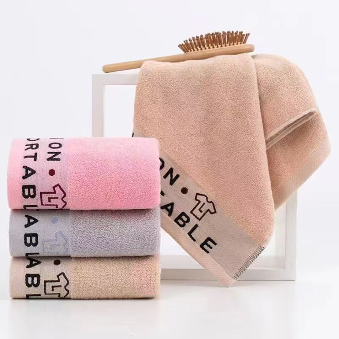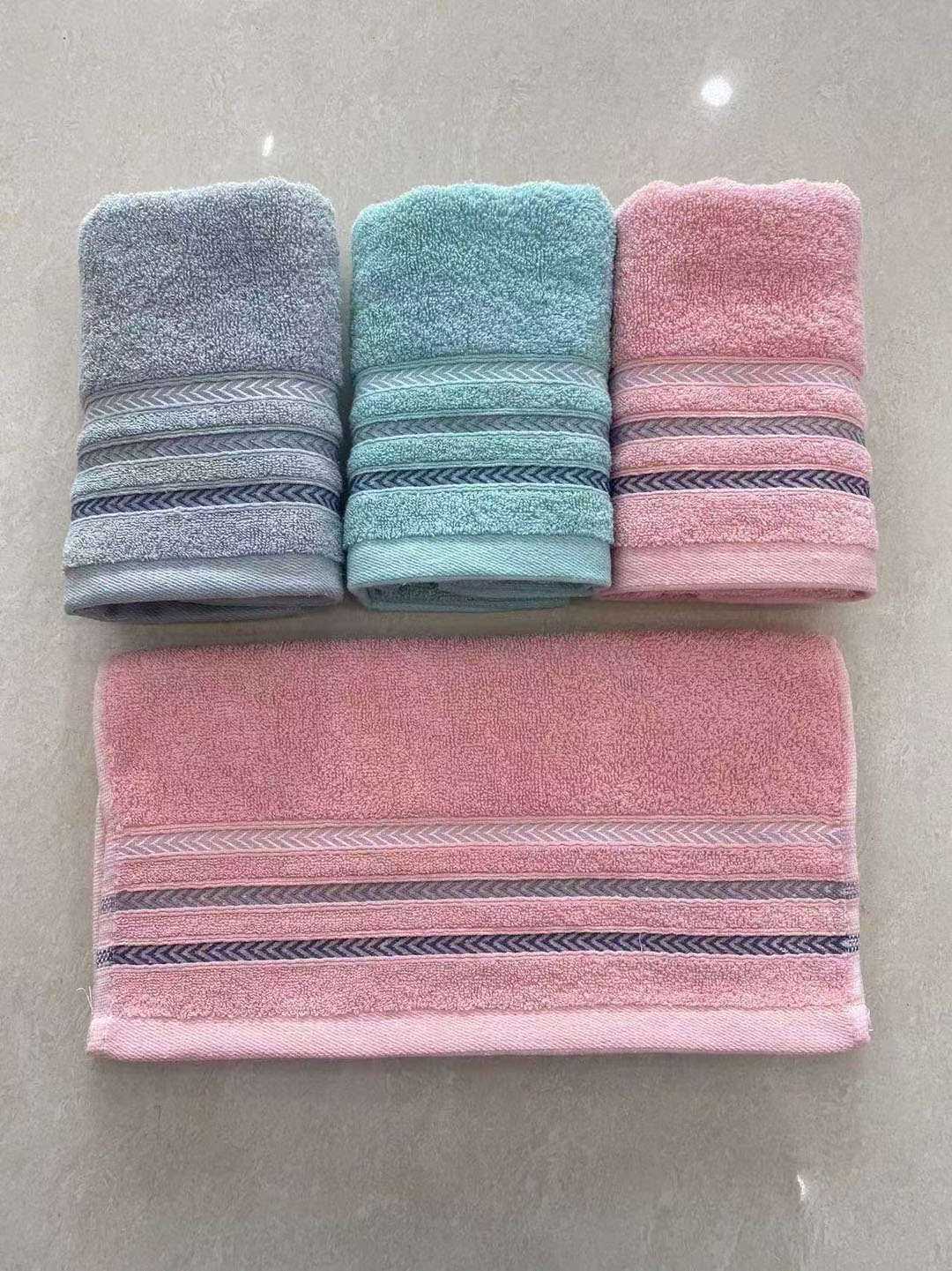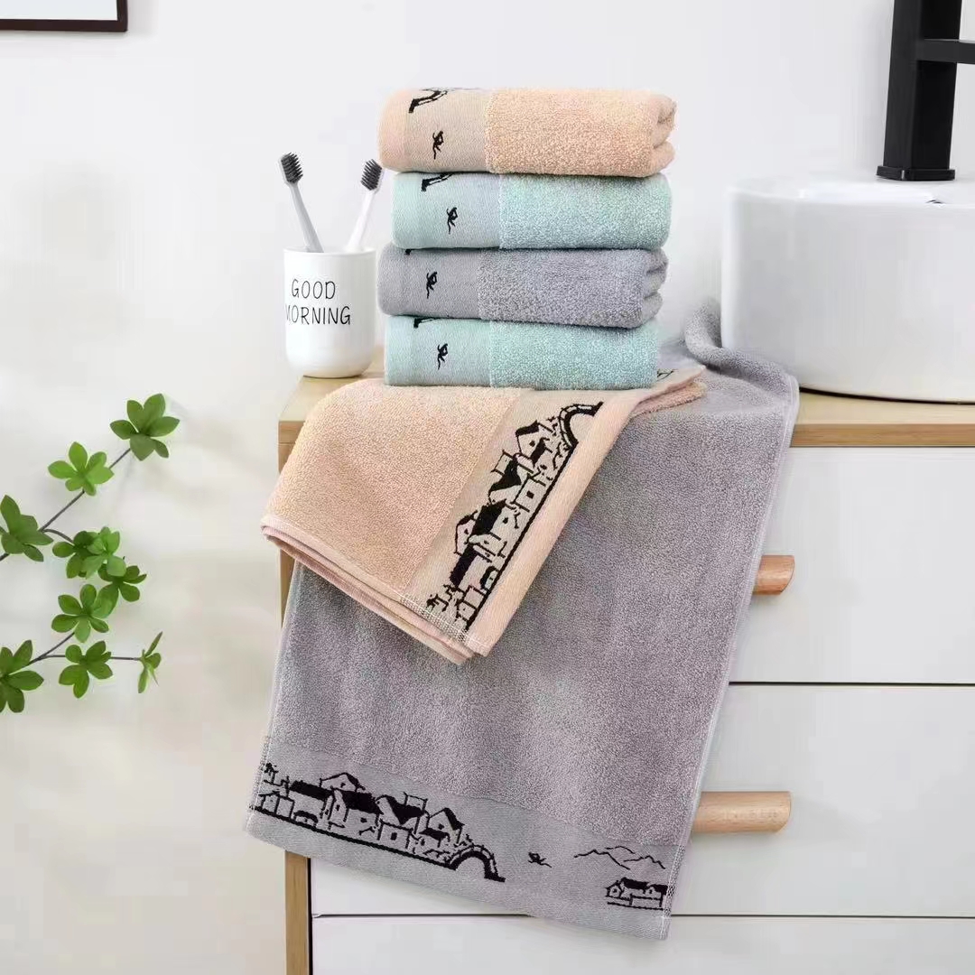 商品名称:14支弱捻纱毛巾 尺寸34cm*74cm 重量110g房子.素运动.三角花.绿茶.树叶花.素字母.字母衣服.三段条等图案毛巾