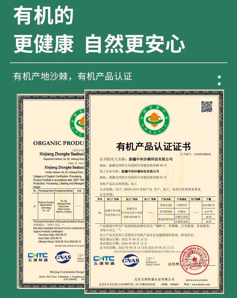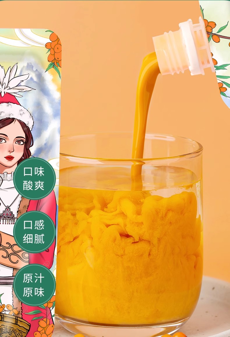 商品名称:棘鲜丰有机沙棘原浆(吸嘴袋)300ml*6袋 有机沙棘原浆原榨沙棘果浆新疆沙棘生榨原液果汁
