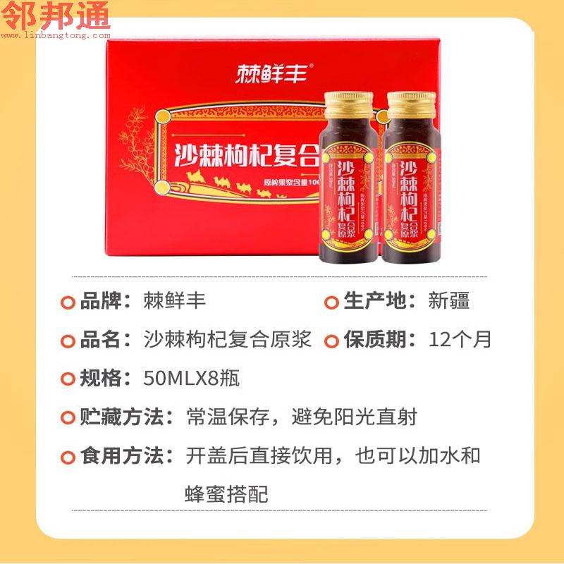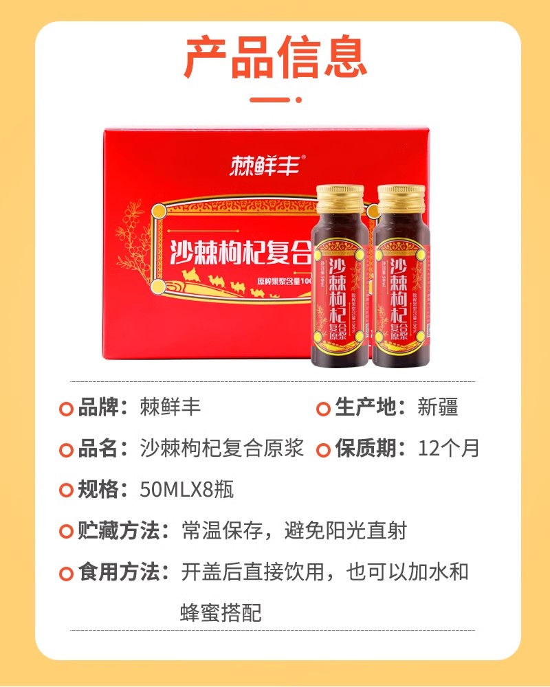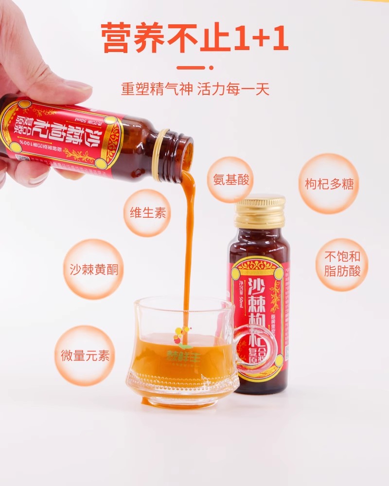 商品名称:棘鲜丰沙棘枸杞复合原浆50ML*8瓶/盒富含维C