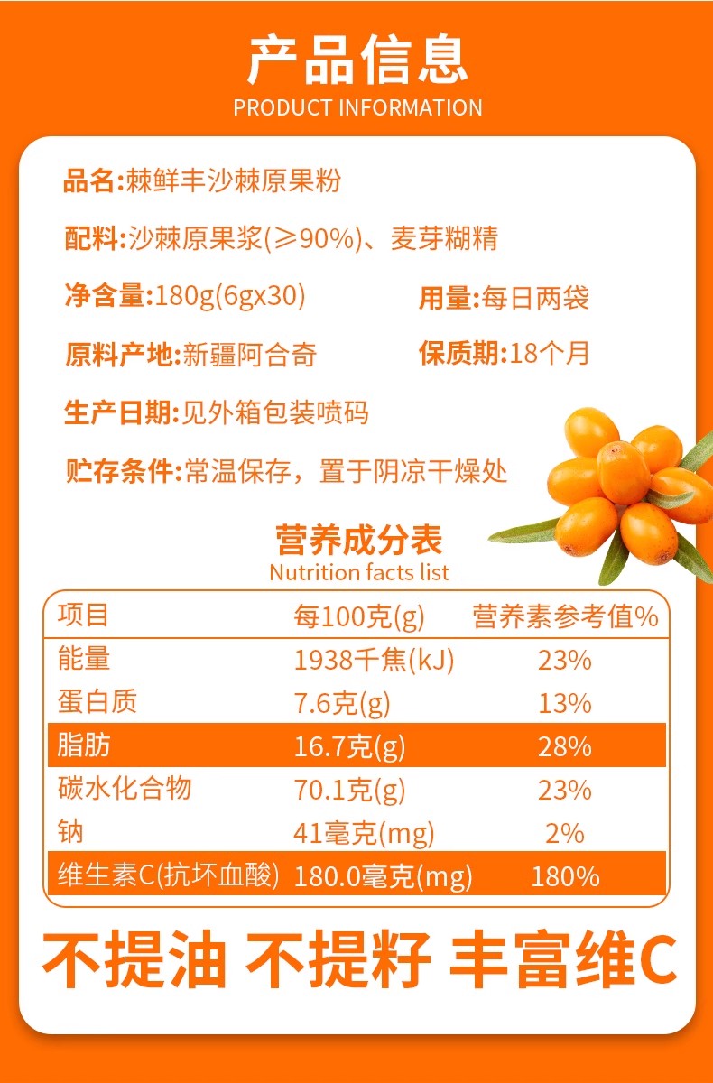 商品名称:沙棘原果粉6g*30袋沙棘原果粉 新疆大果沙棘冻干粉不提油