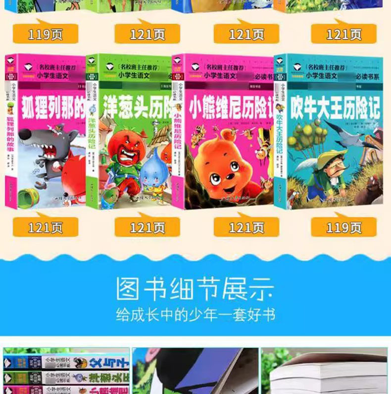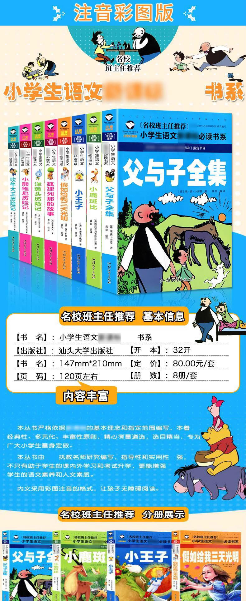 商品名称:小学生语文阅读书系 父与子全集 吹牛大王历险记 狐狸列那的故事 小熊维尼历险记 爱丽丝漫游奇境 钢铁是怎样炼成的 水孩子 草原上的小木屋 洋葱头历险记 中外经典神话汕头大学出版社