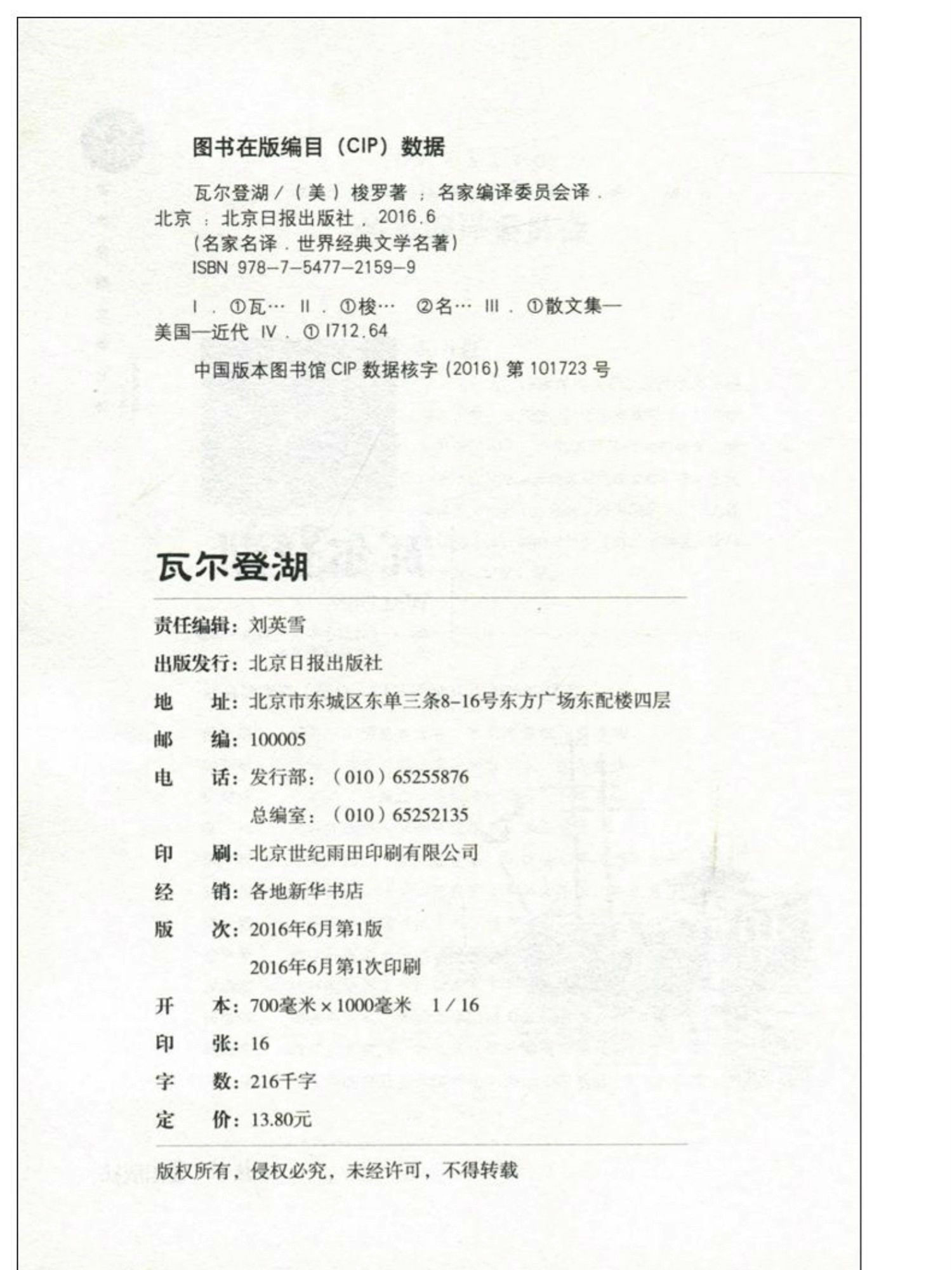 商品名称:名家名译世界经典文学名著-瓦尔登湖 北京日报出版社